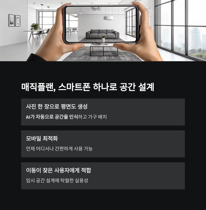 | 모바일 간편 사용 | 매직플랜 | 사진만으로 도면 생성 가능 |