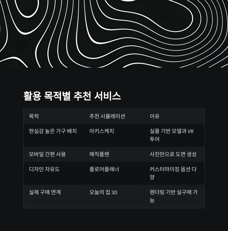| 현실감 높은 가구 배치 | 아키스케치 | 실물 기반 모델과 VR 투어 제공 |