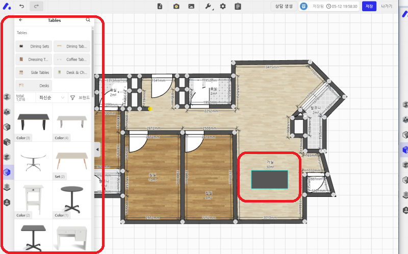 저는 테이블을 배치해볼 예정이므로 "가구 라이브러리"를 선택했습니다.