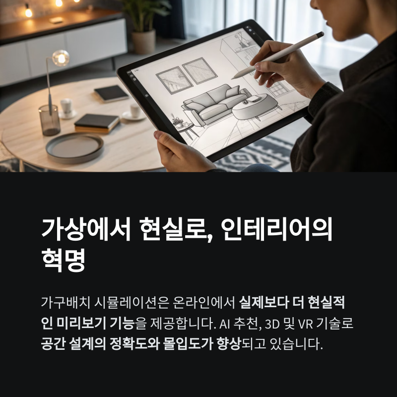 최근의 가구배치 시뮬레이션 서비스는 AI 기술로 사용자의 취향에 맞는 배치 스타일을 제안하거나 VR/AR 기반의 몰입형 경험을 제공하는 방향으로 진화하고 있습니다.