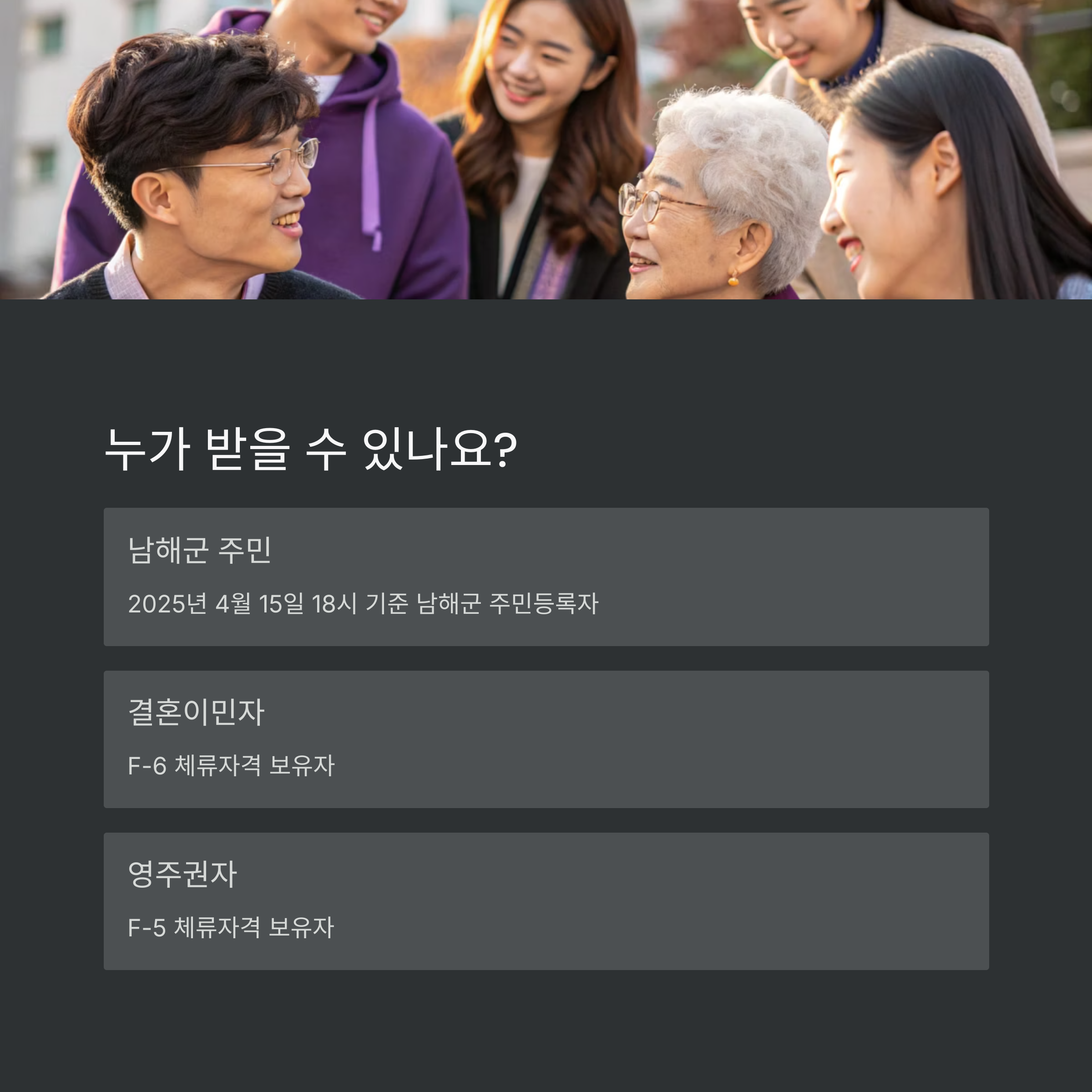 - 2025년 4월 15일 18시 이전까지 남해군에 전입신고가 되어 있어야 함