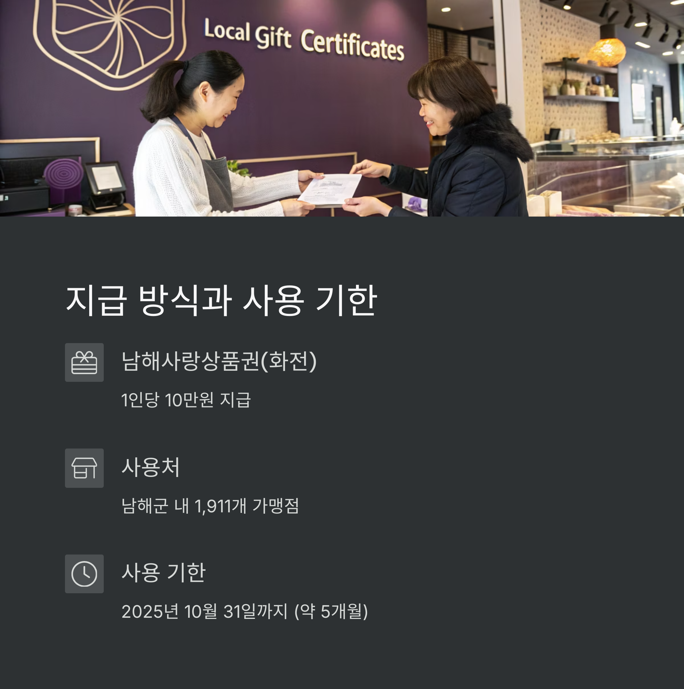 이번 지원금은 남해사랑상품권(화전) 형태로 제공되며,