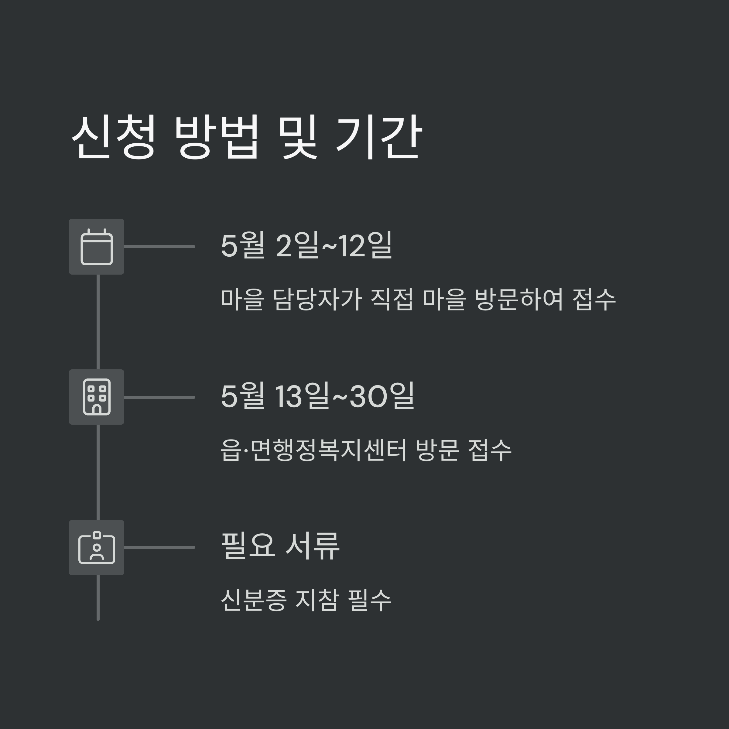 | 5월 13일~5월 30일 | 읍·면센터 방문 접수 | 신분증 |
