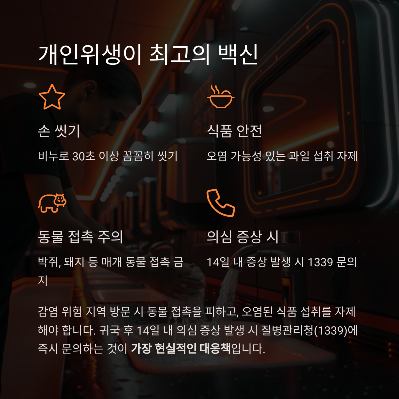 감염 위험 지역 방문 시 동물 접촉을 피하고, 오염된 식품 섭취를 자제해야 합니다. 귀국 후 14일 내 의심 증상 발생 시 질병관리청(1339)에 즉시 문의하는 것이 가장 현실적인 대응책입니다.