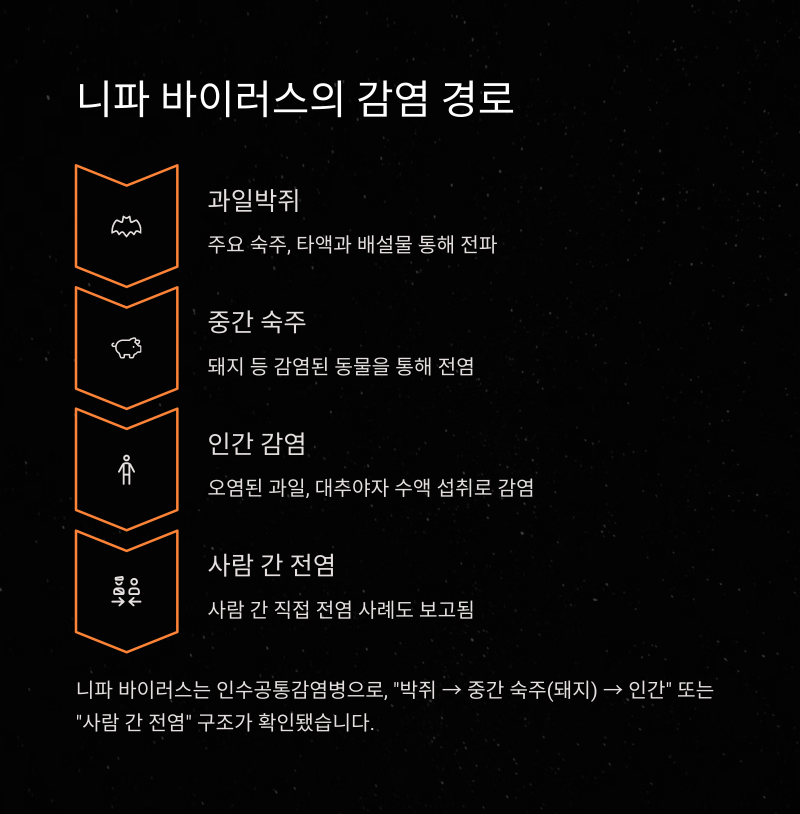니파 바이러스는 과일박쥐가 주요 숙주인 인수공통감염병으로, 박쥐의 타액이나 배설물이 묻은 과일 또는 대추야자 수액 등을 통해 인간에게 전파됩니다. 감염된 돼지 등 중간 숙주 동물을 통해 전염되며, 사람 간 감염도 보고된 바 있습니다.
