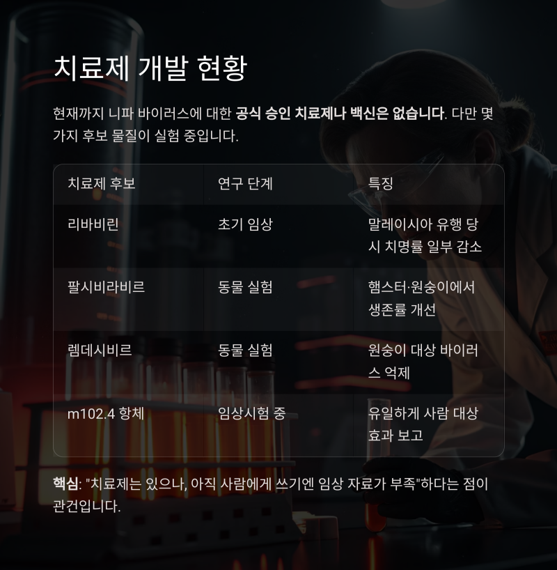 현재까지 니파 바이러스에 대한 공식 승인 치료제나 백신은 없습니다. 다만 몇 가지 후보 물질이 실험 중입니다.