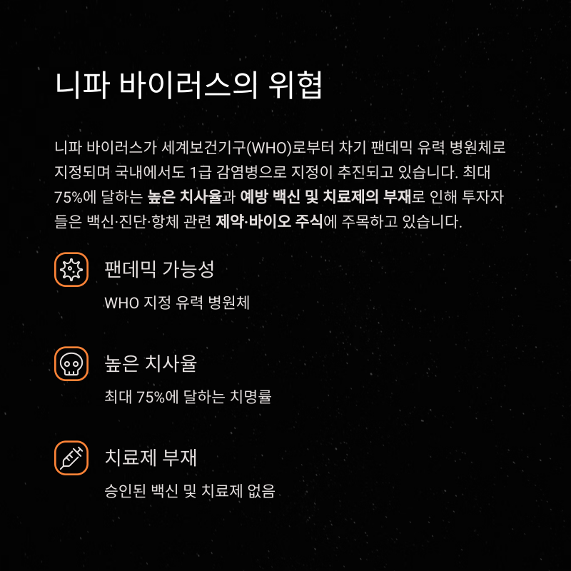 "치사율이 70%를 넘는 병에 백신이 없다? 당연히 시장은 반응할 수밖에 없죠. 하지만 실제 상용화까지는 긴 여정입니다." (투자 리서치 부서 관계자 인용)