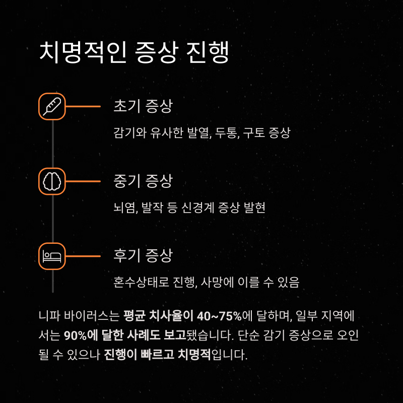 니파 바이러스 감염 초기에는 감기와 유사한 증상(발열, 두통, 구토 등)이 나타나며, 이후 뇌염, 발작, 혼수상태로 진행되어 사망에 이를 수 있습니다. 평균 치사율은 40~75%, 일부 지역에서는 90%에 달한 사례도 보고됐습니다.