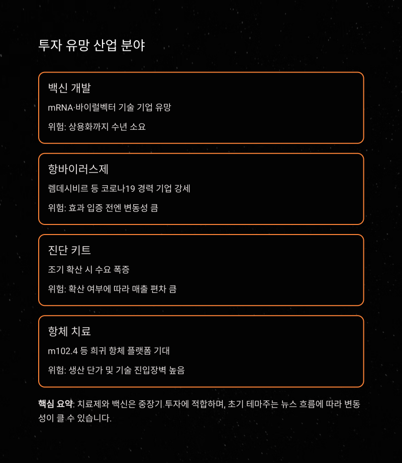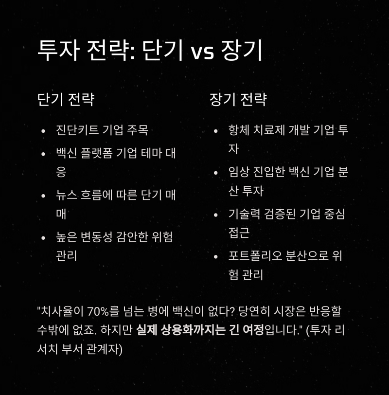 핵심 요약: 치료제와 백신은 중장기 투자에 적합하며, 초기 테마주는 뉴스 흐름에 따라 변동성이 클 수 있습니다.