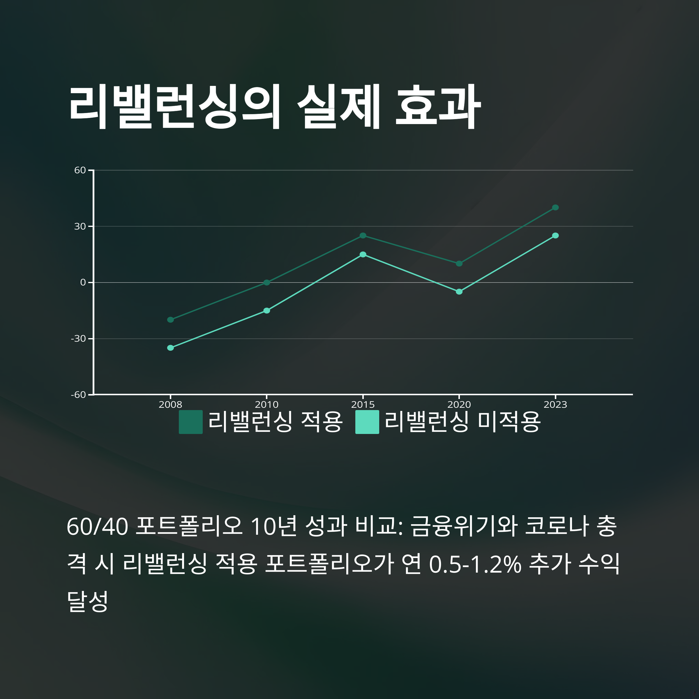 한 투자자는 주식 70%, 채권 30%의 포트폴리오로 시작했습니다. 하지만 몇 년 후 주식 시장이 급등하면서 주식 비중이 90% 이상으로 치솟았고, 이는 포트폴리오의 안정성을 무너뜨리는 원인이 되었습니다. 이후 시장이 조정을 받자 주식의 급락이 전체 자산에 치명적인 타격을 줬습니다. 이는 리밸런싱의 부재가 만든 전형적인 사례입니다. 반면, 같은 시기 비슷한 비율로 시작했지만 분기마다 리밸런싱을 시행한 투자자는 오히려 하락장에서 위험을 낮추고 수익을 방어하는 데 성공했습니다.