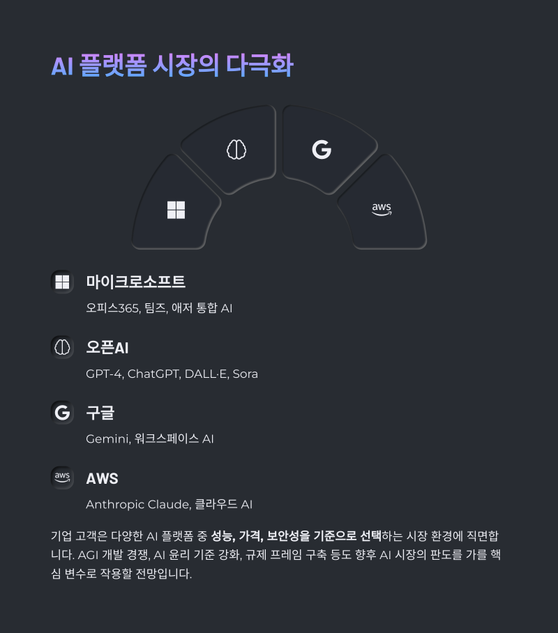 기업 고객은 MS, 오픈AI, 구글(Gemini), AWS(Anthropic Claude) 등 다양한 AI 플랫폼 중 성능, 가격, 보안성을 기준으로 선택하는 시장 환경에 직면합니다.