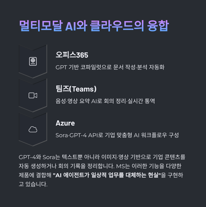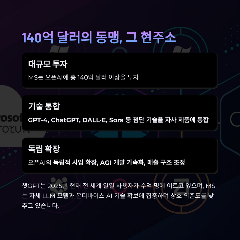 MS는 오픈AI에 총 140억 달러 이상을 투자하며, GPT-4, ChatGPT, DALL·E, Sora 등 첨단 기술을 자사 Azure, 오피스365, 팀즈에 통합해 AI 경쟁력을 극대화해왔습니다.
