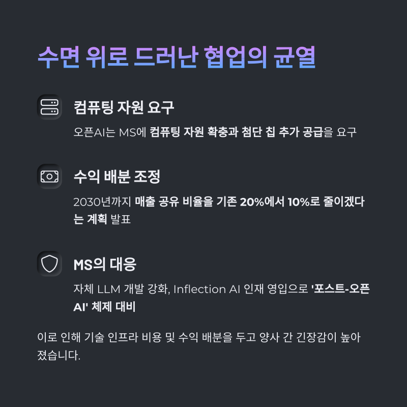 오픈AI는 최근 MS에 컴퓨팅 자원 확충과 첨단 칩 추가 공급을 요구하며, 2030년까지 매출 공유 비율을 기존 20%에서 10%로 줄이겠다는 계획을 발표했습니다.