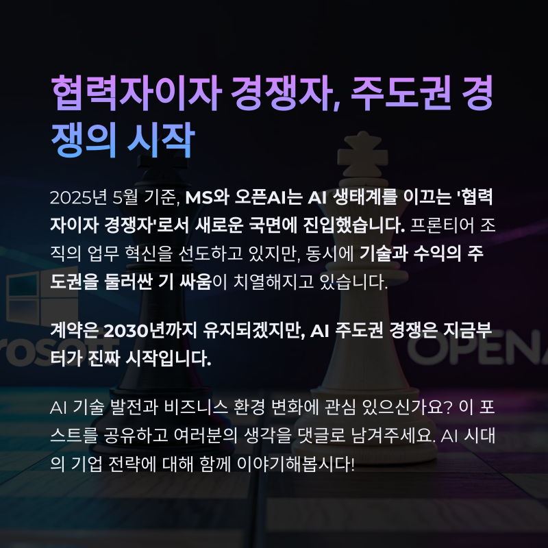 2025년 5월 기준, MS와 오픈AI는 AI 생태계를 이끄는 ‘협력자이자 경쟁자’로서 새로운 국면에 진입했습니다.