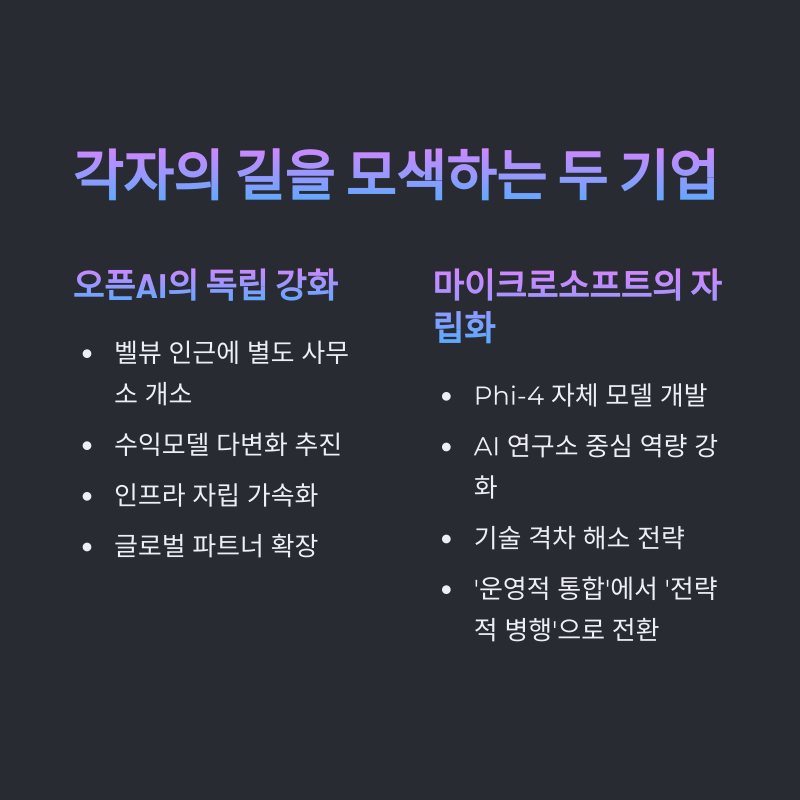 하지만 최근 오픈AI는 독립적 사업 확장, AGI 개발 가속화, 매출 구조 조정에 나섰고, MS는 자체 LLM 모델(예: Phi-4)과 온디바이스 AI 기술 확보에 집중하며 상호 의존도를 낮추고 있습니다.