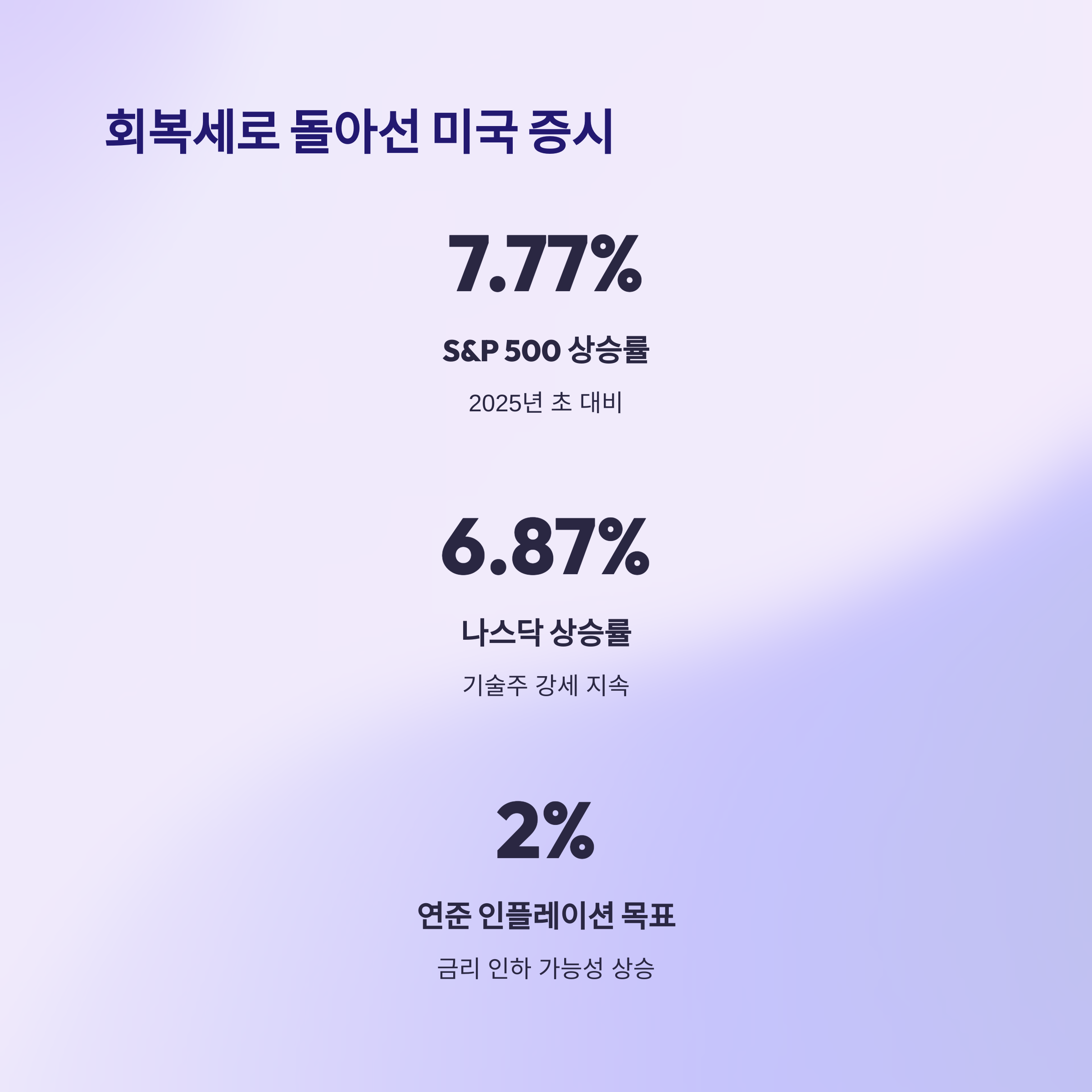 2023년 후반기부터 미국 경제는 예상보다 견고한 소비 지표와 낮아진 인플레이션 수치로 인해 안정을 되찾는 분위기입니다. 이에 따라 미국 연준(Fed)은 추가 금리 인상보다는 동결 또는 인하 가능성을 시사하고 있으며, 이는 투자자들 사이에서 리스크 자산 회복 기대감을 키우는 요인으로 작용하고 있습니다. 특히 나스닥을 중심으로 한 기술주 반등이 뚜렷하게 나타나고 있으며, AI 관련주, 반도체 기업 등은 실적 개선과 함께 빠르게 주가가 반등하고 있습니다. 이러한 흐름 속에서 개인 투자자들의 관심도 점차 높아지고 있습니다. 하지만 시장은 여전히 변수들에 민감하게 반응하기 때문에, 장기적인 관점에서의 투자 전략이 필요한 시점입니다.