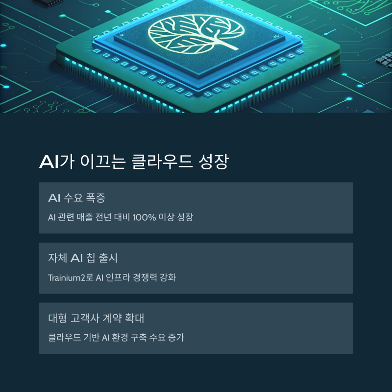 AWS는 이에 발맞춰 자체 AI 칩 Trainium2 출시와 대형 고객사와의 계약 확대로 대응 중이며, AI 관련 매출은 전년 대비 100% 이상 성장했습니다.