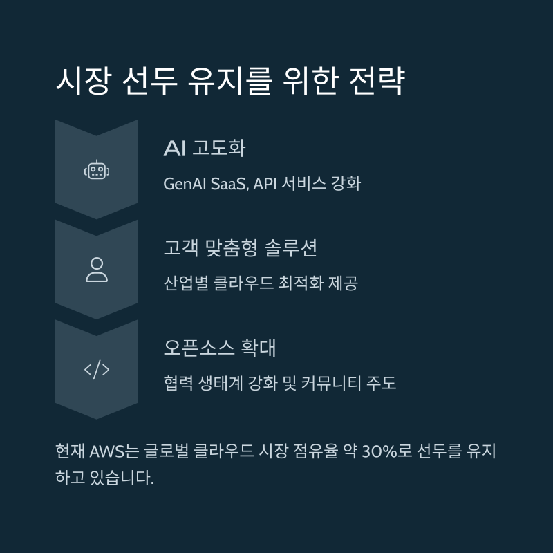 현재 AWS는 글로벌 클라우드 시장 점유율 약 30%로 선두를 유지하고 있습니다.
