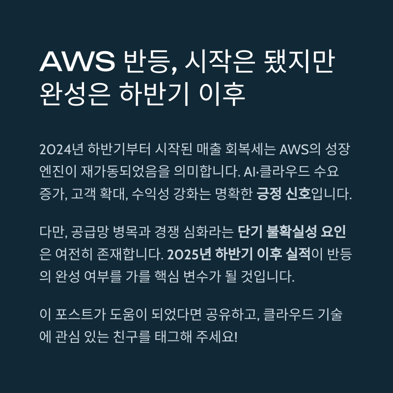 AWS의 2025년 하반기 이후 실적이 반등의 완성 여부를 가를 핵심 변수로 작용할 것입니다.