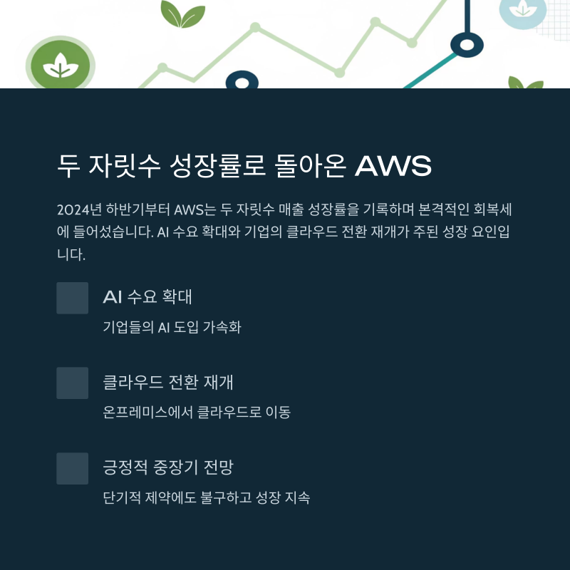 2024년 하반기부터 AWS는 두 자릿수 매출 성장률을 기록하며 본격적인 회복세에 들어섰습니다.