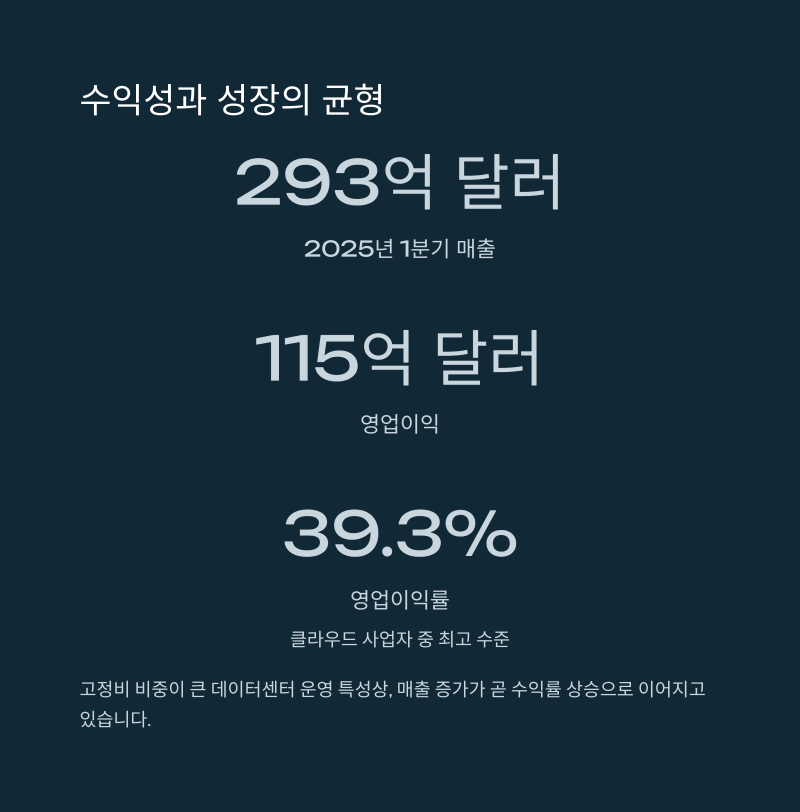 영업이익률은 약 40%로, 글로벌 클라우드 사업자 중 가장 높은 수익성을 유지하고 있습니다.