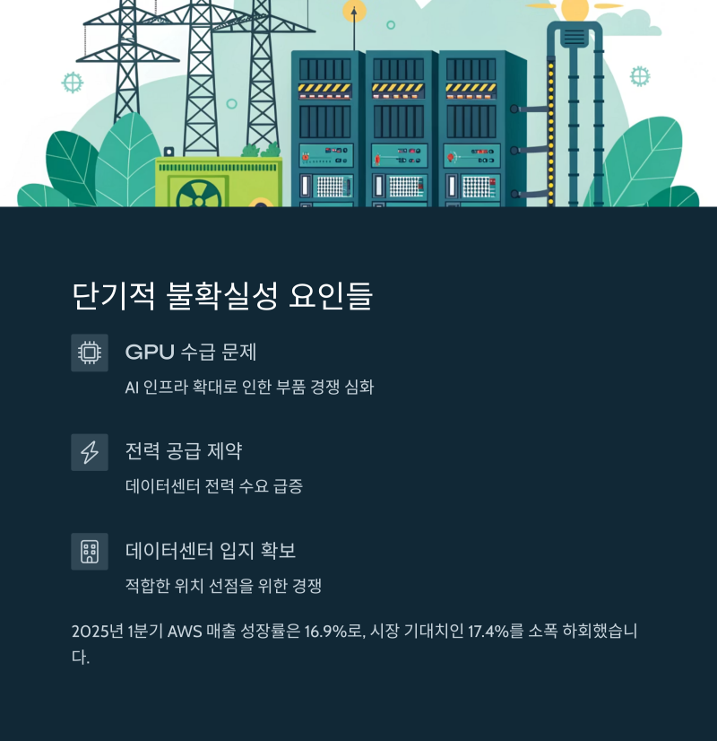 2025년 1분기 AWS 매출 성장률은 16.9%로, 시장 기대치인 17.4%를 소폭 하회하며 공급망 제약이 실적에 영향을 주고 있음을 보여주었습니다.