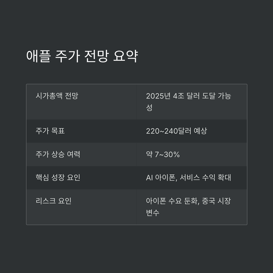 2025년을 앞두고 애플 주가에 대한 기대가 커지고 있습니다. AI 기반 신제품, 서비스 부문 강화, 그리고 4조 달러 시가총액 돌파 전망까지 나오면서 많은 투자자들이 매수 시점을 고민하고 있습니다. 본 글에서는 주요 증권사 전망과 주가 흐름, 리스크 요인까지 종합해 지금이 매수 타이밍인지에 대해 구체적으로 살펴봅니다.