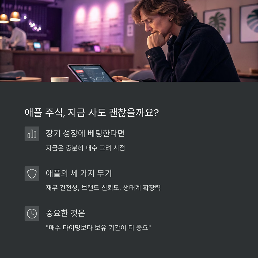 결국 "애플 주식은 매수 타이밍보다 보유 기간이 더 중요하다"는 말처럼,