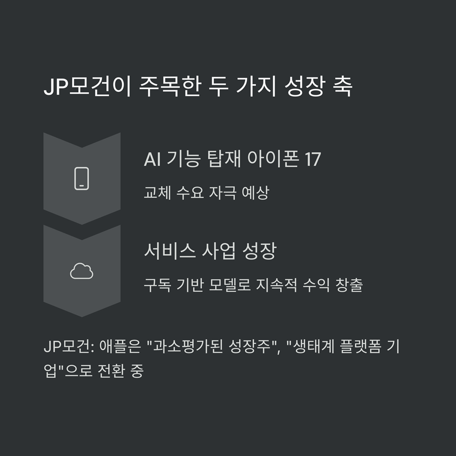 | 핵심 성장 요인 | AI 아이폰, 서비스 수익 확대 | JP모건 |