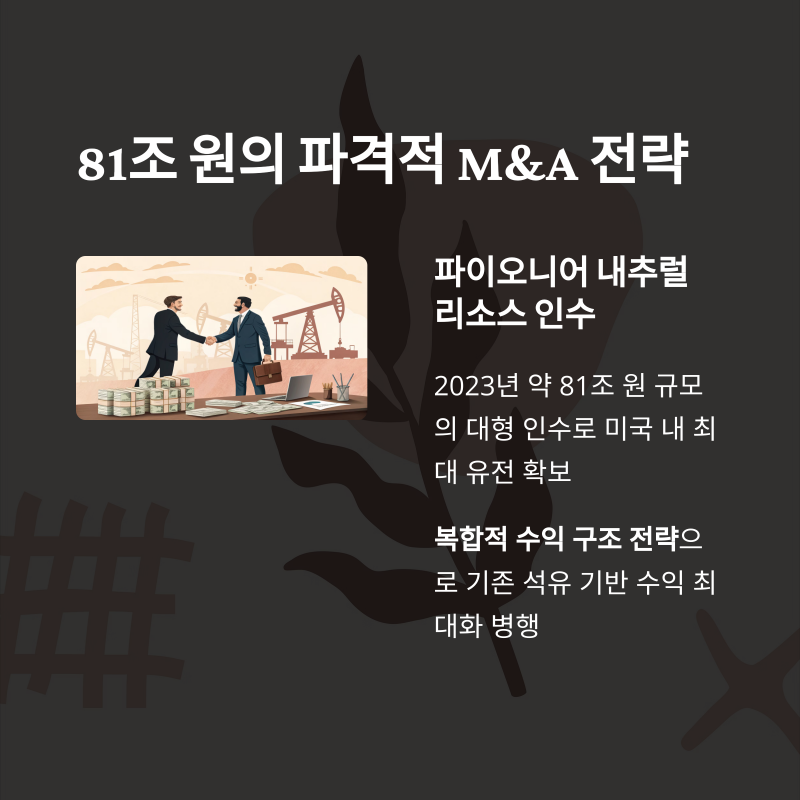 엑슨모빌은 2023년 파이오니어 내추럴 리소스를 약 81조 원에 인수하며 미국 내 최대 유전을 품었습니다.