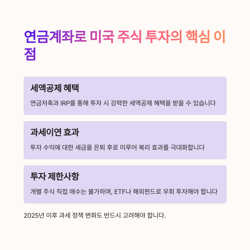 다만 직접 개별 주식을 살 수 없고, ETF나 해외펀드로 우회 투자해야 하며 2025년 이후의 과세 정책 변화도 반드시 고려해야 합니다.