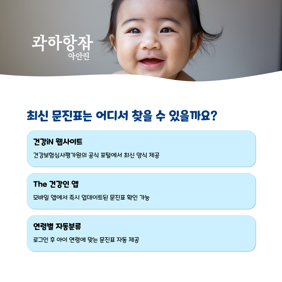 영유아검진문진표 최신 버전은 국민건강보험공단의 공식 채널을 통해 가장 정확하게 확인할 수 있습니다.