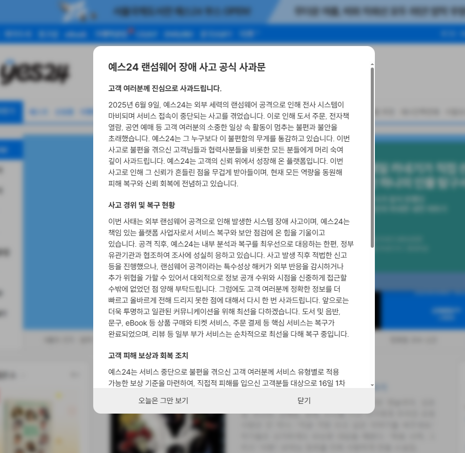 2025년 6월 9일 발생한 예스24의 해킹 사고로 인해 대규모 서비스 장애가 발생했습니다. 도서와 음반, 전자책, 공연 예매 등 주요 기능이 일시적으로 마비되며 고객과 협력사 모두에게 큰 불편을 끼쳤는데요. 이후 예스24는 공식 사과와 함께 1차 보상안을 발표했고, 현재는 서비스 복구와 신뢰 회복에 집중하고 있습니다.