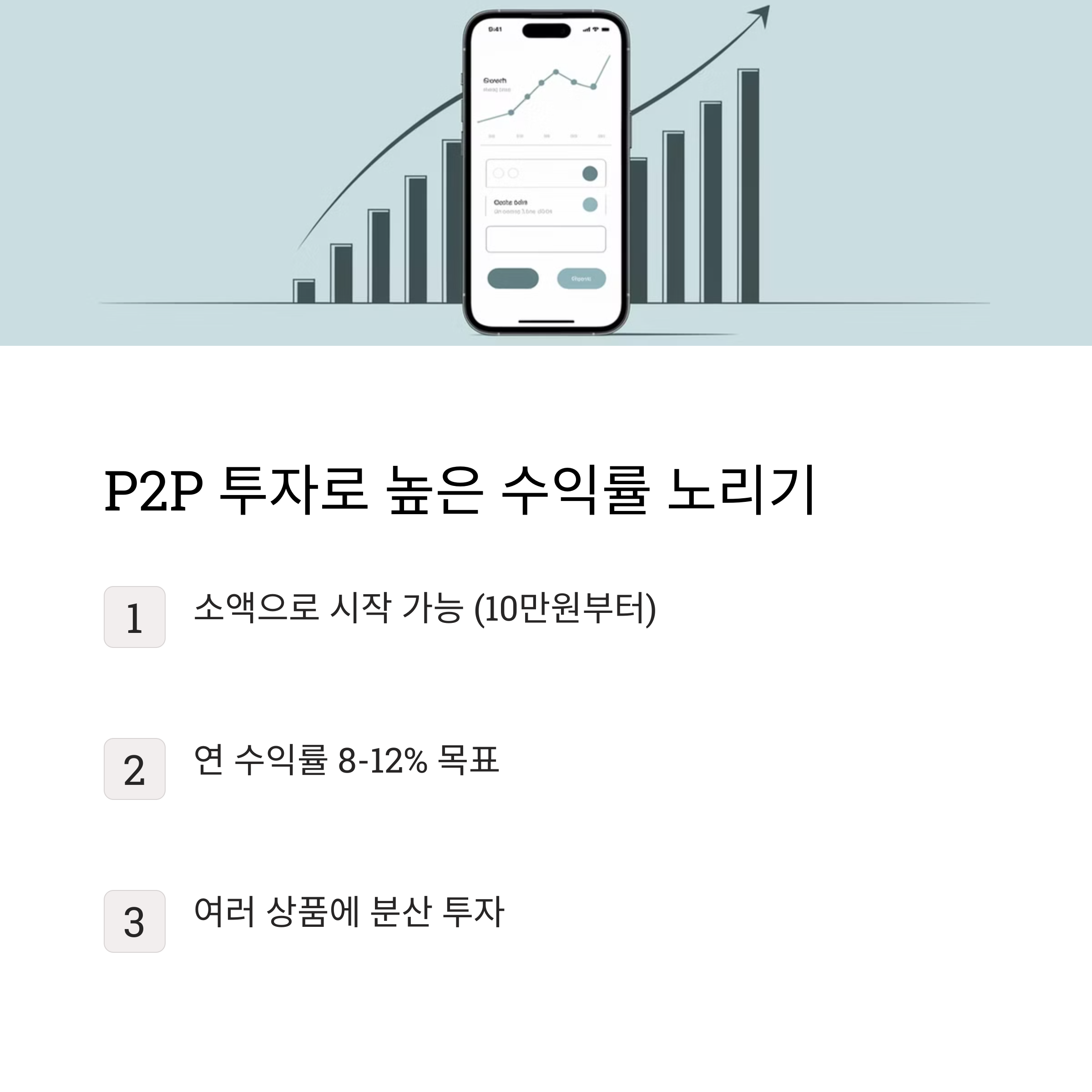 P2P 투자는 높은 수익률을 제공하지만, 플랫폼의 신뢰성과 대출 리스크를 면밀히 분석해야 합니다. 분산 투자를 통해 리스크를 줄이는 것이 중요합니다.
