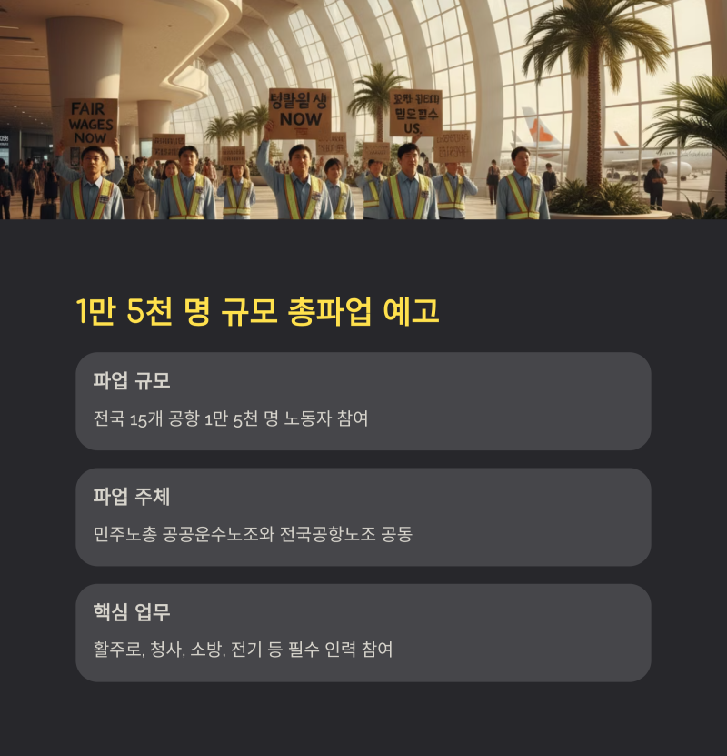 오는 9월 19일부터 인천공항을 포함한 전국 15개 공항에서 1만 5천 명 규모의 노동자 파업이 예고되면서 추석 연휴 항공 대란 우려가 현실이 되고 있습니다. 이번 파업은 민주노총 공공운수노조 인천공항지역지부와 전국공항노조가 함께 주도하는 첫 공동 총파업으로, 단순한 갈등을 넘어선 대규모 사태로 확산될 가능성이 큽니다. 특히 활주로, 청사, 소방, 전기 등 핵심 업무를 담당하는 인력까지 대거 참여할 경우 항공기 지연·결항은 피하기 어려울 전망입니다.