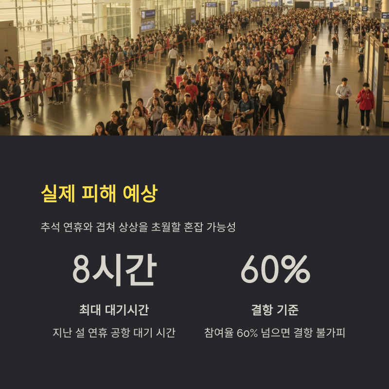 이번 파업은 특히 추석 연휴와 겹친다는 점에서 파급력이 큽니다. 이미 지난 설 연휴에도 파업이 없었음에도 불구하고, 신형 검색 장비 적응 문제로 공항 대기 시간이 최대 8시간에 달했습니다. 노조는 “참여율이 60%를 넘을 경우 결항 사태가 불가피하다”고 밝히며 긴장을 높이고 있습니다.