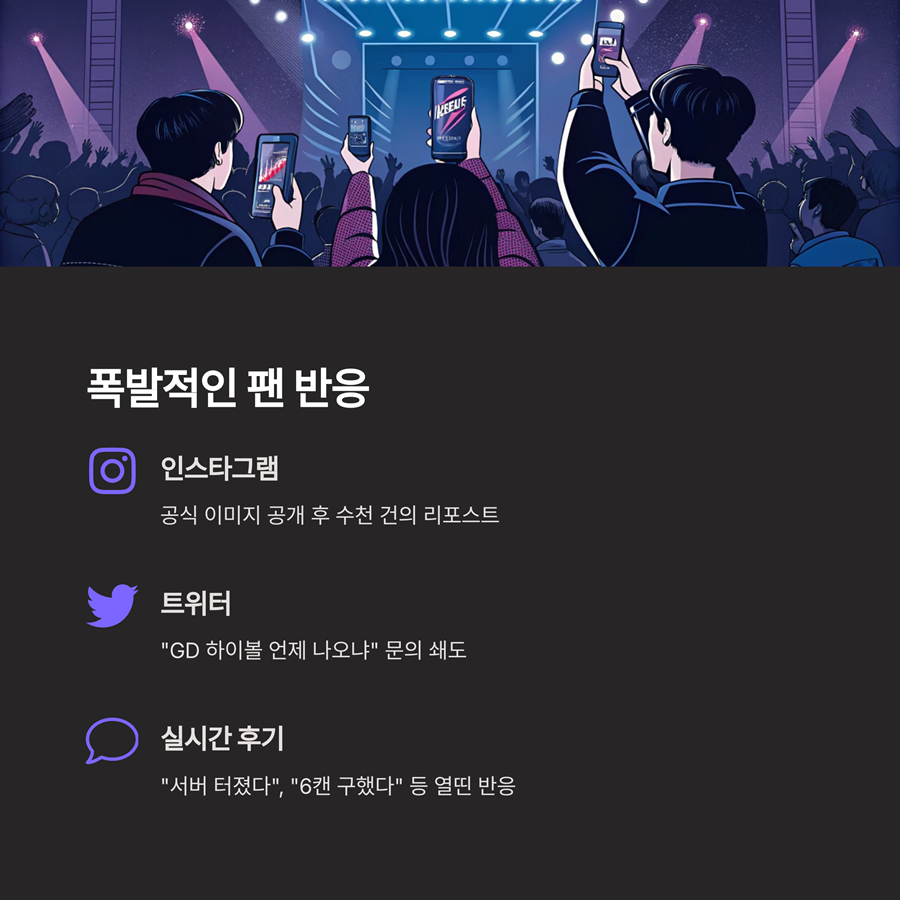 출시 전부터 팬카페, 인스타그램, 트위터 등에서 “GD 하이볼 언제 나오냐”는 문의가 쇄도했고,