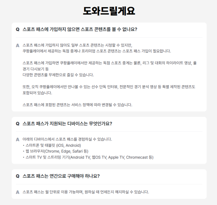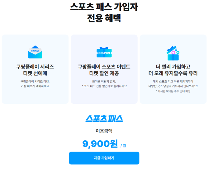 스포츠패스 단독으로는 가입이 불가능하며 쿠팡 와우 멤버십(월 7,890원) 가입이 전제 조건입니다.