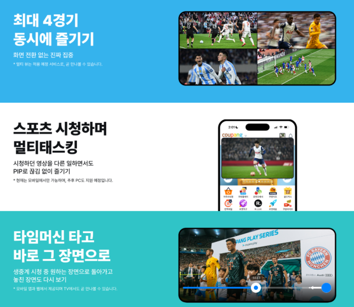 기능 면에서도 프리미엄 서비스를 지향합니다. 특히 향후 적용 예정인 ‘멀티뷰’ 기능은 최대 4경기를 동시에 시청할 수 있도록 개발 중입니다.