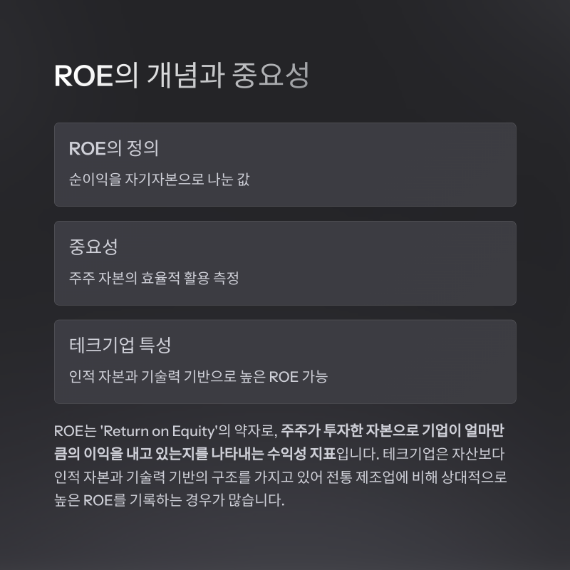 테크기업은 자산보다 인적 자본과 기술력 기반의 구조를 가지고 있어 전통 제조업에 비해 상대적으로 높은 ROE를 기록하는 경우가 많습니다.