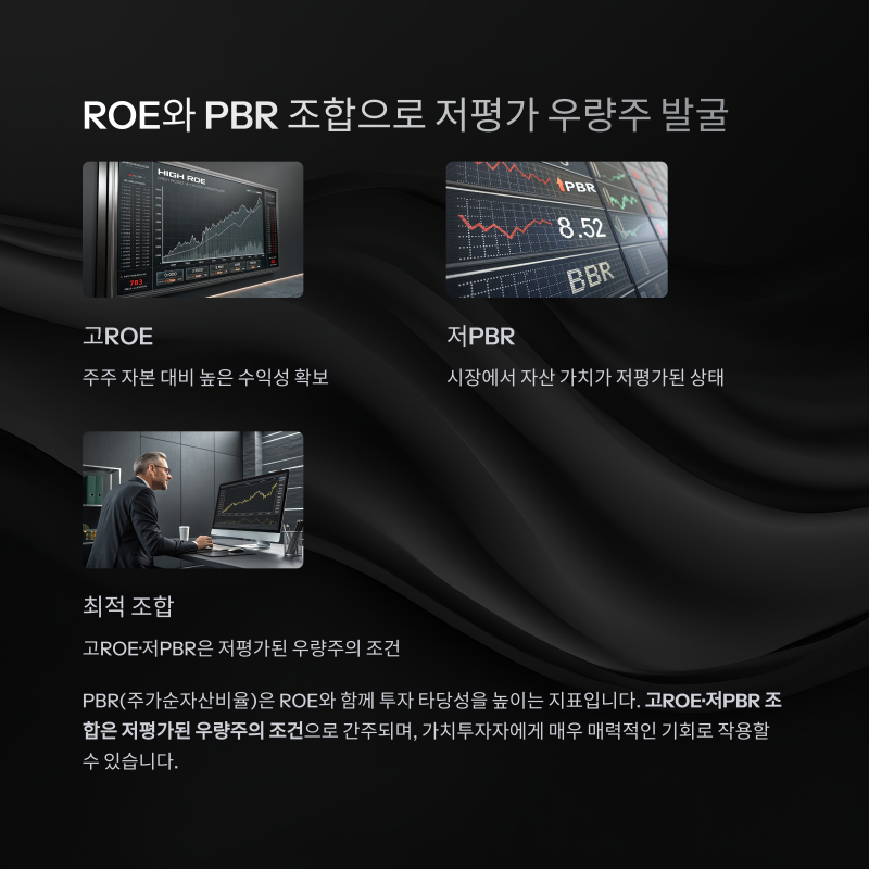 PBR이 낮다는 것은 시장에서 해당 기업의 자산 가치가 저평가돼 있다는 뜻이며,고ROE·저PBR 조합은 저평가된 우량주의 조건으로 간주됩니다.