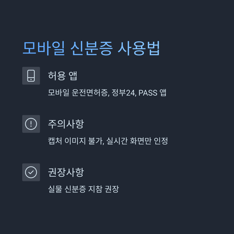 주의사항: 모바일 신분증은 캡처 이미지 사용이 불가능하며, 앱을 직접 열어 실시간 인증 화면을 제시해야 합니다.