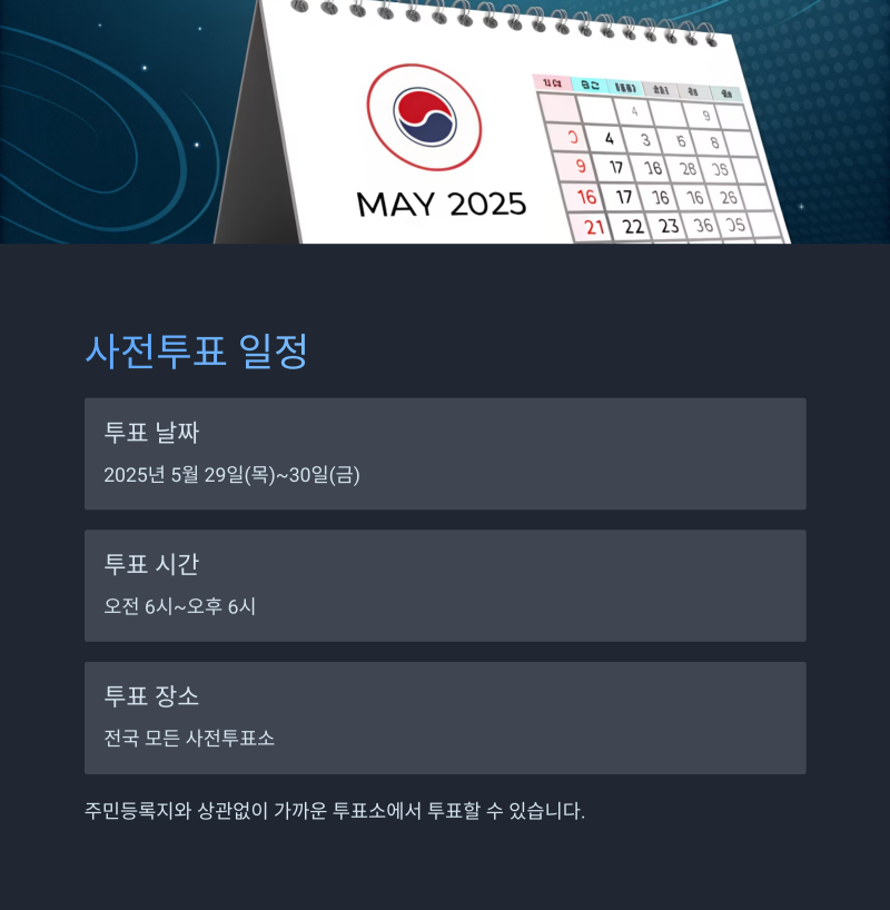 2025년 사전투표는 5월 29일(목)과 5월 30일(금), 이틀간 오전 6시부터 오후 6시까지 진행됩니다.