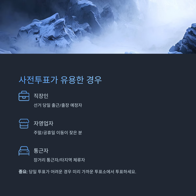 중요: 사전투표는 전국 어디서나 가능한 만큼, 당일 투표가 어려운 경우 미리 가까운 투표소에서 한 표를 행사하는 것이 가장 효율적입니다.
