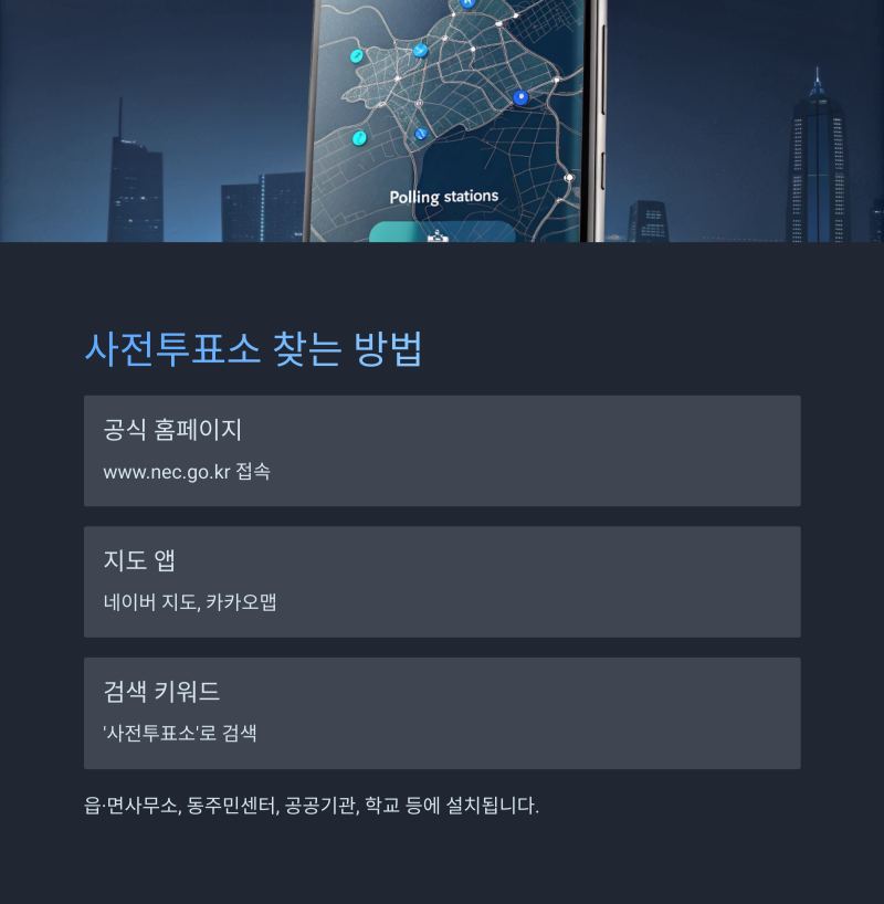 | 장소 | 전국 사전투표소 어디서나 가능 |