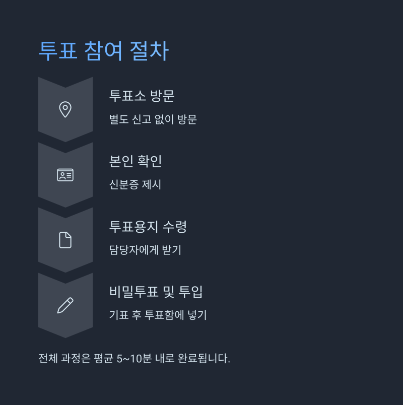| 절차 | 방문 → 본인 확인 → 투표용지 수령 → 기표 → 투입 |
