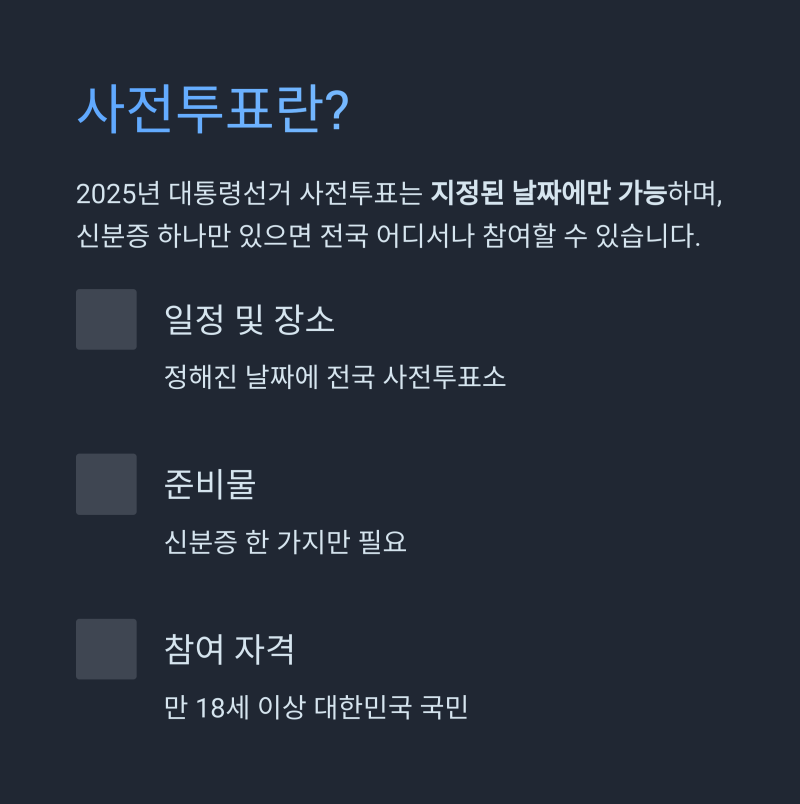 2025년 대통령선거가 다가오며 많은 분들이 사전투표 참여 방법과 준비물을 궁금해하고 있습니다.