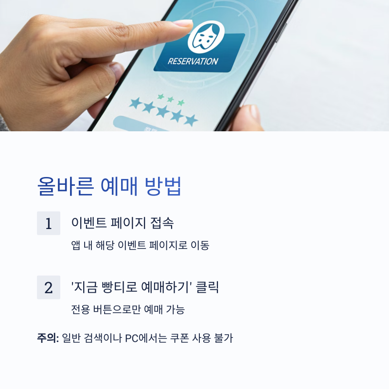 오직 앱 내 이벤트 페이지의 전용 버튼을 통해서만 예매 가능하다는 점을 기억하세요.