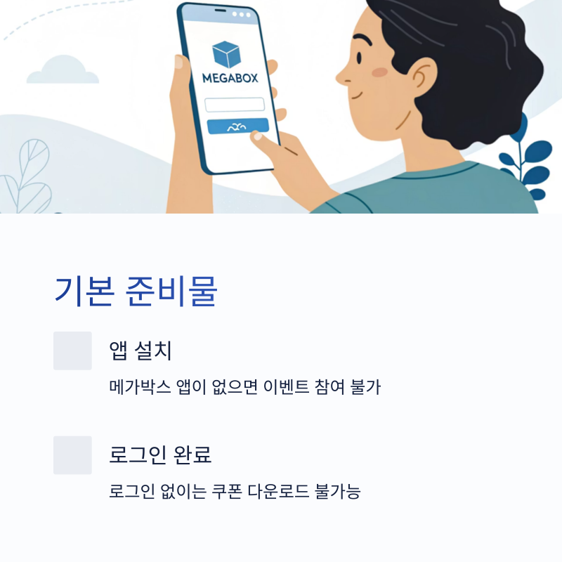 앱이 설치되어 있지 않으면 이벤트 자체를 확인할 수 없고, 로그인하지 않으면 쿠폰 다운로드나 예매도 불가능합니다.