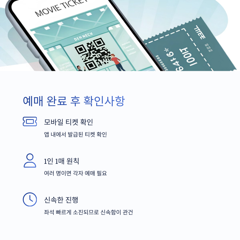 예매 완료 후 모바일 티켓 확인, 1인 1매 원칙 적용